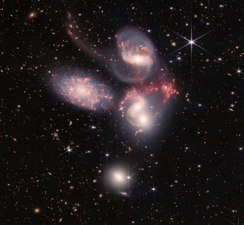 O interesse no Quinteto de Stefan, um grupo de quatro galáxias em interação (a quinta estava acidentalmente no enquadramento), é sublinhado pelo facto de James Webb ter capturado este objeto na sua primeira sessão de imagens científicas assim que iniciou o trabalho científico. Anteriormente, o Quinteto de Stefan foi fotografado por outros telescópios ópticos e de rádio. Estes últimos fornecem a imagem mais completa da distribuição de gás e poeira na região de colisão e do comportamento da frente de onda de choque dos halos de galáxias em colisão.