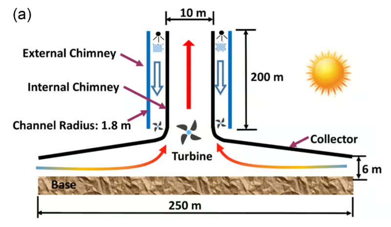 O sistema é denominado TTSS (sistema solar de tecnologia dupla) ou “sistema solar de tecnologia dupla”. Um coletor gigante do tipo estufa com diâmetro de 250 m coletará o ar aquecido de uma grande área e o exalará através de um orifício no centro com diâmetro de 13,6 m. O fluxo de ar que entra na torre de 200 m de altura girará um grande turbina na base do tubo.