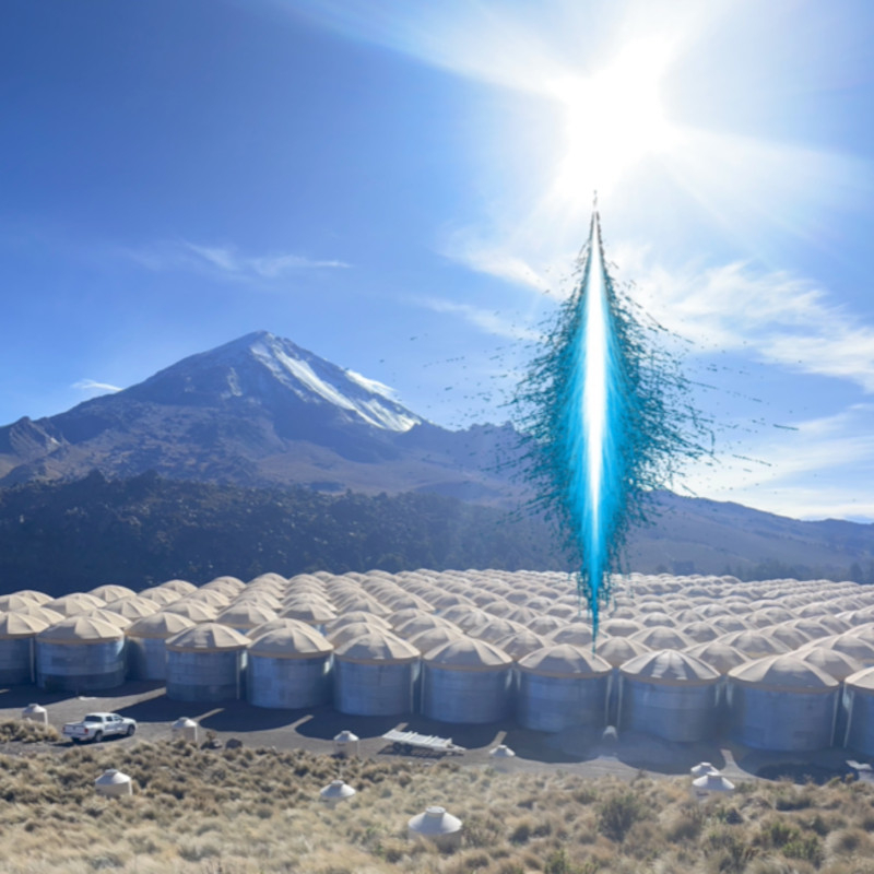 A imagem mostra o observatório HAWC observando partículas cujas trajetórias são mostradas como linhas azuis, geradas pela radiação gama de alta energia do Sol.