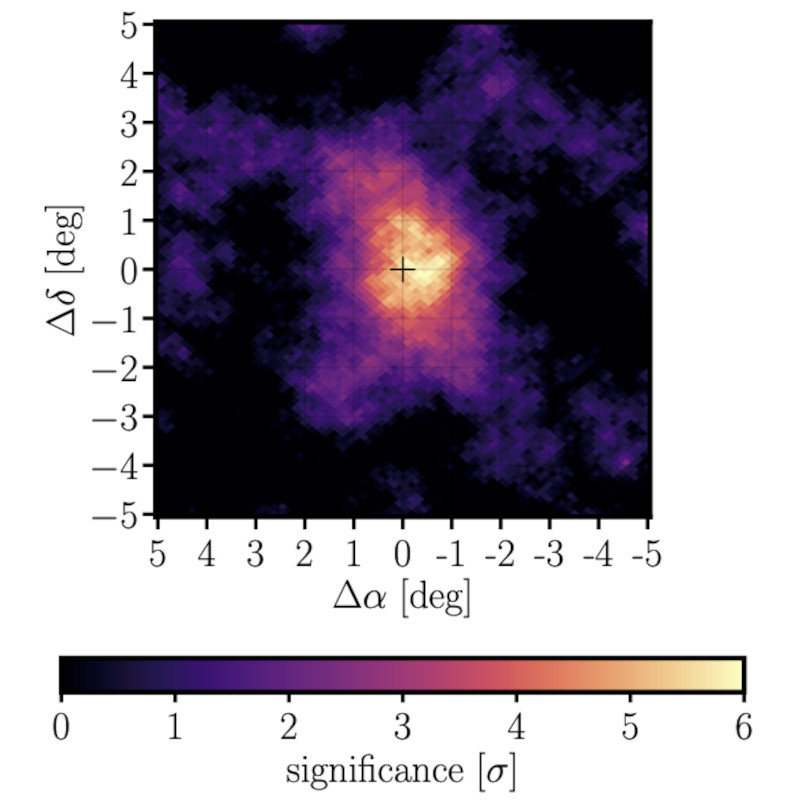 É assim que se parece um excesso de radiação gama solar do observatório HAWC. O mapa de calor mostra uma mancha amarela brilhante no centro cercada por manchas laranja e roxas mais frias.