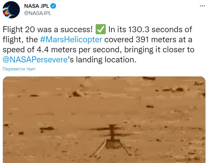 Durante o voo de aniversário, o helicóptero marciano permaneceu no ar por 130,3 segundos e percorreu 391 metros a uma velocidade média de 4,4 m/s. Agora o helicóptero, após uma série de testes de voo, está retornando ao local de pouso da plataforma de descida em Marte, de onde começará a alcançar o rover Perseverance para servir como veículo de reconhecimento aéreo para ele. O rover neste momento está se movendo ao longo da cratera Lake Lake, com 45 km de largura, onde pousou em fevereiro do ano passado. Antigamente, havia um lago neste local e o rover vai até o leito do antigo rio marciano, onde nos sedimentos do fundo espera encontrar sinais da existência de vida biológica em Marte no passado.