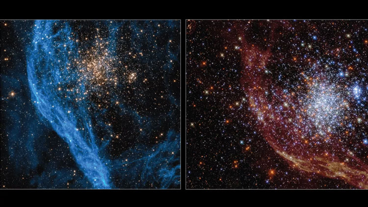 Um instantâneo do aglomerado globular NGC 1850 em dois intervalos condicionais mostrou imagens completamente diferentes. A imagem da esquerda na imagem acima foi tirada no infravermelho próximo, e a imagem da direita estava nas faixas visível e ultravioleta extremo (todas as imagens são cores sintéticas, já que as câmeras Hubble cobrem a faixa inacessível à visão humana). Na imagem da esquerda, vemos a população estelar antiga do aglomerado, que inclui cerca de 200 gigantes vermelhas, e na imagem da direita, estrelas jovens e predominantemente azuis.