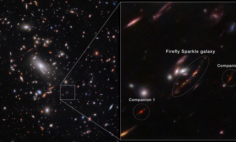 A Firefly Sparkle Galaxy é observada 600 milhões de anos após o Big Bang. Possui 10 zonas distintas de formação estelar ativa. Cada zona tem uma massa de 105 a 106 massas solares. Estas observações dão à ciência a primeira visão espectrofotométrica de uma galáxia típica nos estágios iniciais do seu desenvolvimento no Universo. A galáxia Sparkle Firefly ainda tem duas galáxias anãs companheiras, cujo papel para a Via Láctea é desempenhado pelas galáxias Grande e Pequena Nuvens de Magalhães.