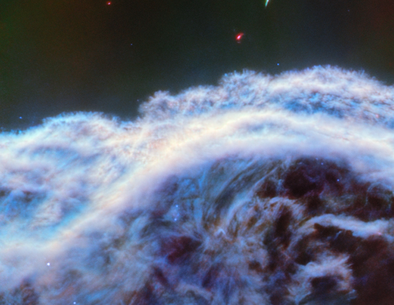 Usando os instrumentos infravermelhos de Webb, os cientistas obtiveram pela primeira vez uma imagem da “juba” da Cabeça de Cavalo – uma região fronteiriça do espaço com 0,8 anos-luz de comprimento. Os pesquisadores estavam interessados no comportamento da poeira e do gás na região de dispersão, onde esses processos são mais claramente visíveis.