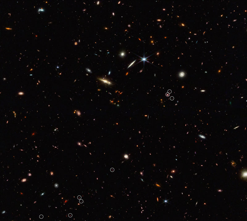 As galáxias ligadas por filamentos são marcadas com círculos, e o quasar unificador está no centro dos três círculos à direita. Fonte da imagem: NASA, ESA, CSA