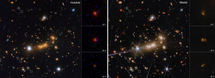 Comparação de fotografias dos telescópios Hubble (esquerda) e James Webb (direita)