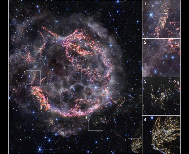 Na véspera de Natal, a NASA apresentou imagens dos restos previamente bem estudados da supernova Cassiopeia A. As imagens foram obtidas por sensores Webb na faixa do infravermelho próximo e médio. Cada uma das imagens mostrou suas próprias nuances, já que a luz em cada faixa destacava estruturas de matéria ligeiramente diferentes nas proximidades deste objeto.