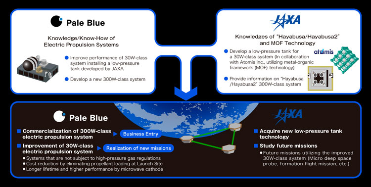 No âmbito da colaboração Pale Blue e JAXA apresentarão duas classes de propulsão iônica instalações: 30 W e 300 W. Os motores de 30 Watts vai servir para manter o orbit científica de sondas e para longas missões (mais econômico), e 300-W motores capaz de manter os satélites de baixa órbita ao redor da Terra.