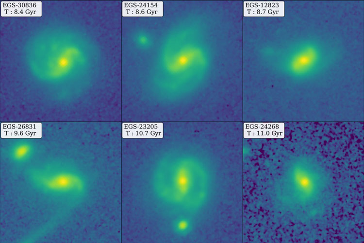 Um grupo de astrofísicos da Universidade do Texas em Austin, em imagens feitas por James Webb, conseguiu identificar claramente duas galáxias espirais barradas a uma distância de 10,7 (EGS-23205) e 11 (EGS-24268) bilhões de anos-luz de nós. . Anteriormente, a imagem da galáxia EGS-23205 foi tirada pelo Hubble, mas os jumpers não apareciam na foto. Somente a imagem repetida desta galáxia obtida por “James Webb” permitiu destacar suas barras sem dúvida.