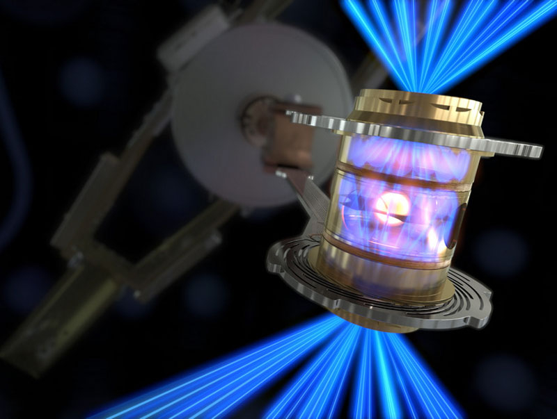 Visualização da irradiação de combustível com feixes de laser, que são convertidos em raios-x para desencadear a fusão