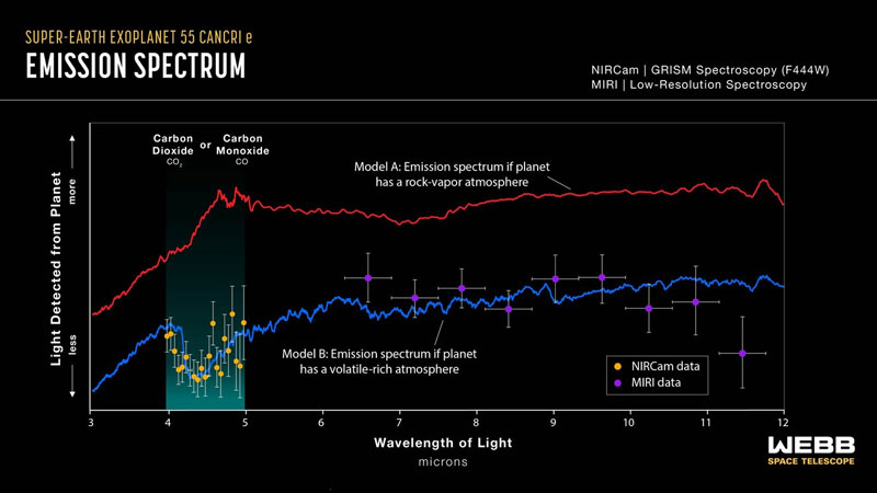 Pequenas flutuações de luz na faixa de 4 a 12 mícrons revelaram absorções de linhas espectrais sinalizando a presença de monóxido de carbono e dióxido de carbono na atmosfera de 55 Câncer e, que aparentemente são liberados e mantidos (mais importante neste estudo) pela atmosfera global. oceano de magma. Em outras palavras, o mundo rochoso cria e mantém de forma independente uma concha atmosférica. A atmosfera primária teria sido destruída há muito tempo pela radiação de uma estrela próxima.