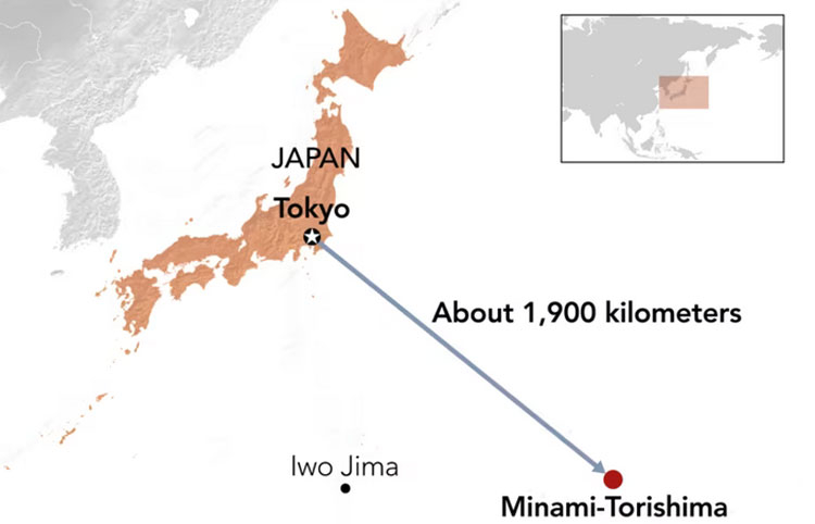 Suficientes para a extração economicamente viável de elementos de terras raras, foram encontrados depósitos na área da ilha de Minami-Torishima, um atol de coral no Oceano Pacífico a cerca de 1.900 km a sudeste de Tóquio. Metais de terras raras estão localizados em uma camada de lodo no fundo, a uma profundidade de cerca de 6.000 m. A tarefa de levantar lodo de tal profundidade não é trivial em si (não é óleo ou gás que vai subir do bem sob sua própria pressão). O trabalho nessa área será complicado pela forte corrente de Kuroshio e pelos tufões sazonais, que tradicionalmente passam por essas áreas.