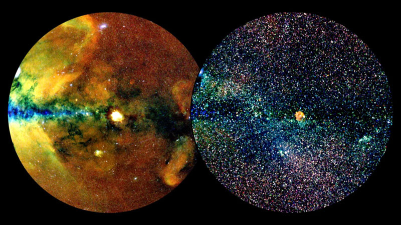 Representações dos dados do catálogo eRASS1: à esquerda – fontes estendidas, à direita – fontes pontuais. Fonte da imagem: eROSITA-Konsortium