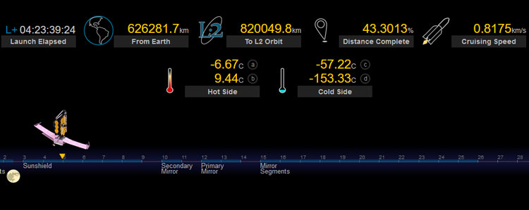 A NASA criou uma página com dados sobre o movimento do telescópio James Webb e disponibilizou parte da telemetria da espaçonave. Em particular, os dados são transmitidos de quatro sensores de temperatura do telescópio: dois no lado iluminado e dois na sombra. No momento em que este artigo foi escrito, o telescópio acelerou para 0,8175 km / se cobriu 43,3% da rota até o ponto de origem.