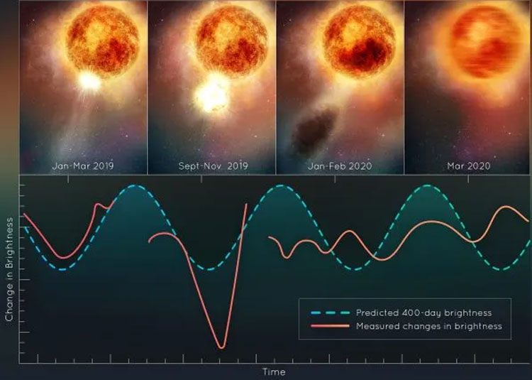As observações do Hubble permitiram ver como Betelgeuse restaura gradualmente a fotosfera e a luminosidade perdidas. Os dados coletados permitem que os cientistas, com um erro conhecido, restaurem a sequência de eventos que ocorreram com Betelgeuse no momento do lançamento. Externamente, a estrela parece quase a mesma de antes, antes da ejeção de massa da superfície titânica, que era 400 bilhões de vezes mais abundante do que uma ejeção coronal normal em nosso Sol. Mas a análise da fotosfera sugere que tudo dentro da estrela deu errado – “está zumbindo dentro como um sino”, de acordo com um dos pesquisadores. De qualquer forma, a estrela deixou de obedecer ao ciclo de 400 dias de luminosidade, que os astrônomos celebram há quase dois séculos seguidos.