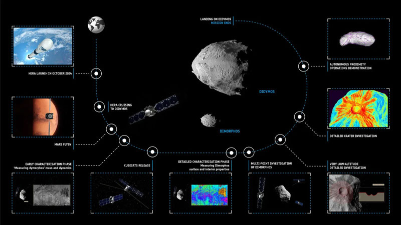 A sonda Hera chegará aos asteróides alvo em outubro de 2026. Ao longo do caminho, acelerará no poço gravitacional de Marte e tirará fotos de um de seus satélites, Deimos. Esta será uma oportunidade para testar os equipamentos de navegação da sonda e, principalmente, sua câmera de alta resolução.