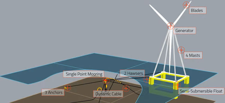 Os ventos mais fortes são registrados em mar aberto, e não na plataforma com profundidades rasas. Se estendermos para o mar aberto o projeto de um moinho de vento familiar para terra e prateleira – um poste longo com um rotor horizontal, o custo dos materiais para a torre, a gôndola e o contrapeso aumentará muito e mais rápido crescerá , quanto mais longas as lâminas e mais alta a torre.