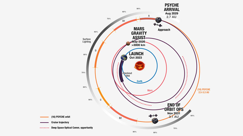 Em maio, Marte usará sua gravidade para acelerar a estação, como se fosse um estilingue, que a direcionará para o asteroide alvo. O asteroide Psique é intrigante porque pode ser uma cópia ou um embrião do núcleo metálico interno do nosso planeta. Não podemos estudar o núcleo da Terra, mas pudemos observar seu “gêmeo” na forma do asteroide Psique.