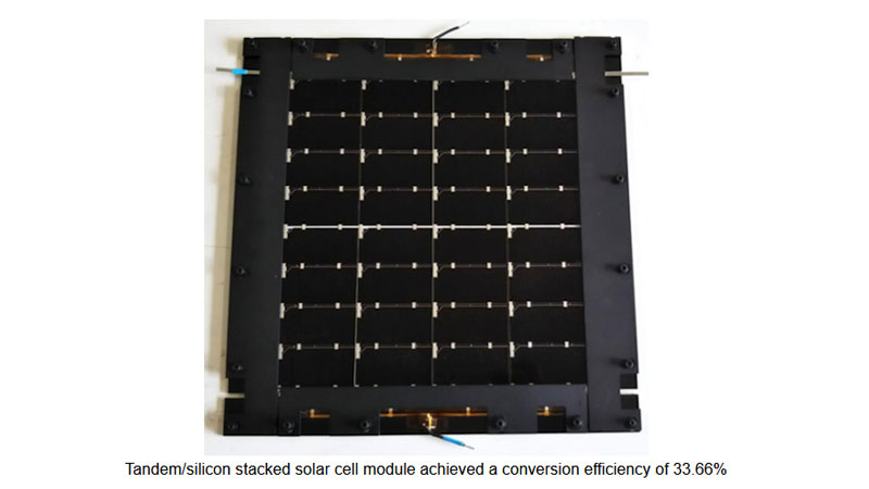 No ano passado, o elemento tandem de três junções da Sharp, de acordo com o AIST (Instituto Nacional de Ciência e Tecnologia Industrial Avançada do Japão), estabeleceu um recorde mundial de eficiência, mostrando uma eficiência de 32,65%. O novo elemento perdeu uma junção e passou a ser formalmente de duas junções, o que aumentou o fluxo de luz para a camada de silício subjacente e permitiu aumentar a eficiência para um novo valor recorde de 33,66%.