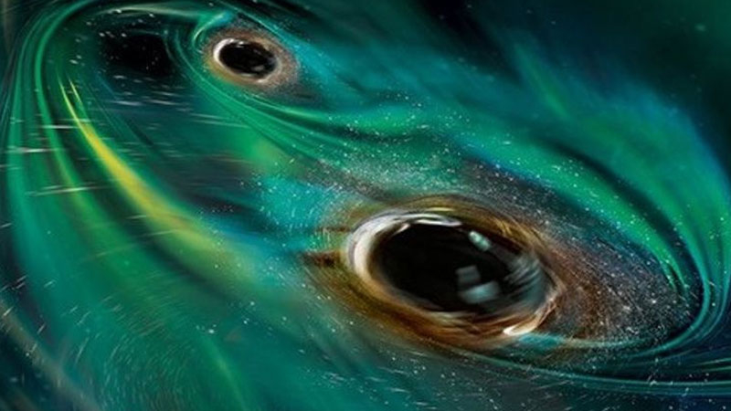 Representação artística da fusão de um par de buracos negros envolvendo uma nuvem de gás. Fonte da imagem: NASA