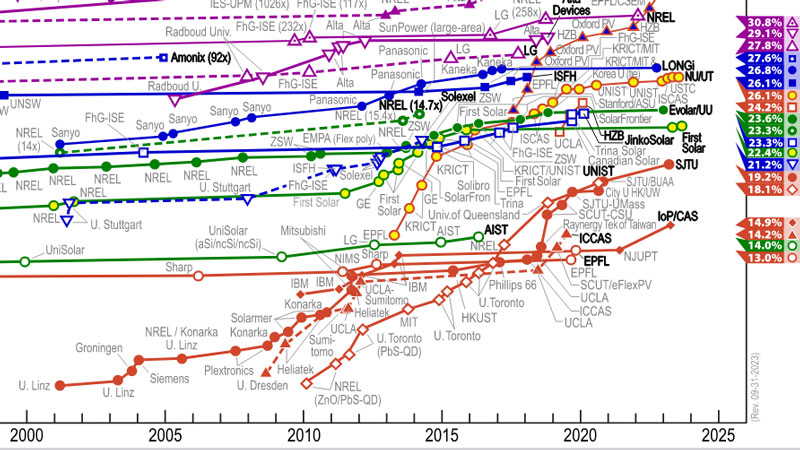 Parte de um gráfico que mostra os avanços nas células fotovoltaicas. Os pontos quânticos são indicados por um diamante. Fonte da imagem: NREL