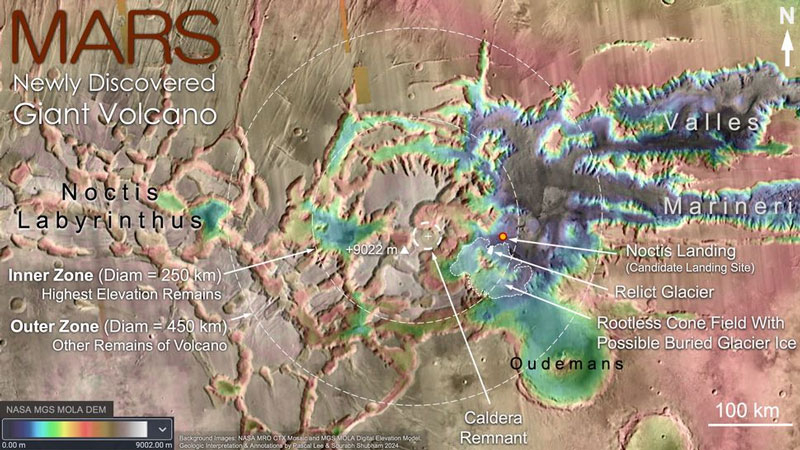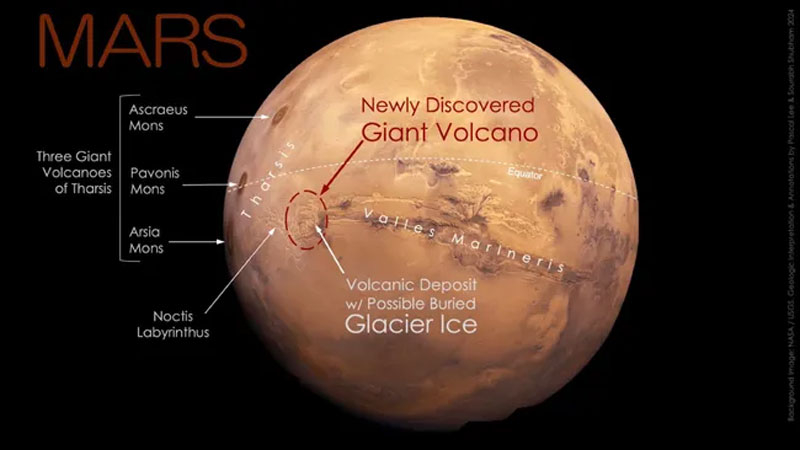 Recentemente, durante a 55ª Conferência Científica sobre a Lua e os Planetas, um grupo de astrônomos relatou que um vulcão gigante extinto havia sido descoberto perto do equador de Marte. Esta formação é tão óbvia que só podemos perguntar por que os cientistas a ignoraram. Imagens desta área estão disponíveis desde a missão Mariner 9 da NASA em 1971. Combinada com outros factores, a área do vulcão pode tornar-se um alvo para o próximo rover a aterrar em Marte.