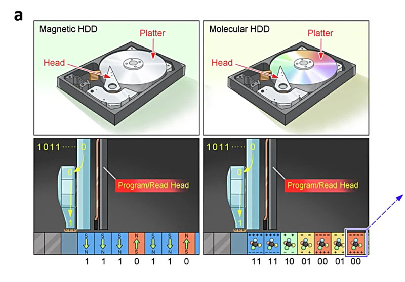Um grupo de cientistas chineses publicou um artigo na revista Nature intitulado “Lógica molecular de discos rígidos para armazenamento criptografado de grandes quantidades de dados”. Os pesquisadores demonstraram a capacidade de registrar até 96 estados em cada “ponto” da unidade, o que pode ser comparado à tecnologia de uma célula NAND 3D de seis bits. Isso pode ser um avanço na criação de dispositivos de armazenamento de alta capacidade do futuro.