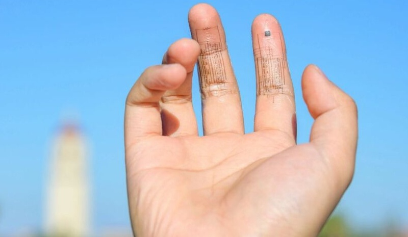 «Electronic Skin é como um adesivo ultrafino. Uma folha de filme transparente consiste em um circuito integrado flexível com uma fonte de alimentação de 5 volts. A estrutura de três camadas da e-skin é dielétrica, com cada camada contendo nanoestruturas orgânicas que podem ser projetadas individualmente para responder a diferentes sinais sensoriais: enquanto uma pode sentir a temperatura, a outra ajuda o usuário a sentir a pressão. Cada camada tem menos de um mícron de espessura. Para melhorar a durabilidade, a “e-skin” é fixada a um substrato flexível, cuja espessura é comparável à espessura da camada externa da pele humana.