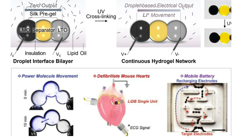 Uma pequena bateria de íons de lítio foi desenvolvida para uma série de aplicações biológicas. O conjunto da bateria é colocado em uma gota d’água. Ele pode ser usado em sistemas para estimular o músculo cardíaco, administrar medicamentos e alimentar nanorrobôs médicos. A bateria foi testada em ratos e um dia será usada para tratar humanos.