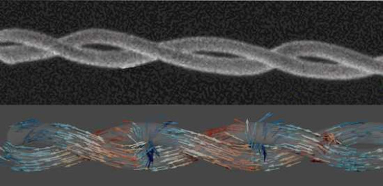 Em vez de um único nanofio, os pesquisadores propuseram uma espiral de dois nanofios – na verdade, um gêmeo do DNA. O estudo dessa torção mostrou que as paredes de domínio adjacentes estão conectadas umas às outras e esses pares se tornam superestáveis. Além disso, campos magnéticos bizarros são formados no espaço em torno dos nanofios espirais magnetizados. Isso foi observado em instalações de raios-X em tempo real e durante a simulação.