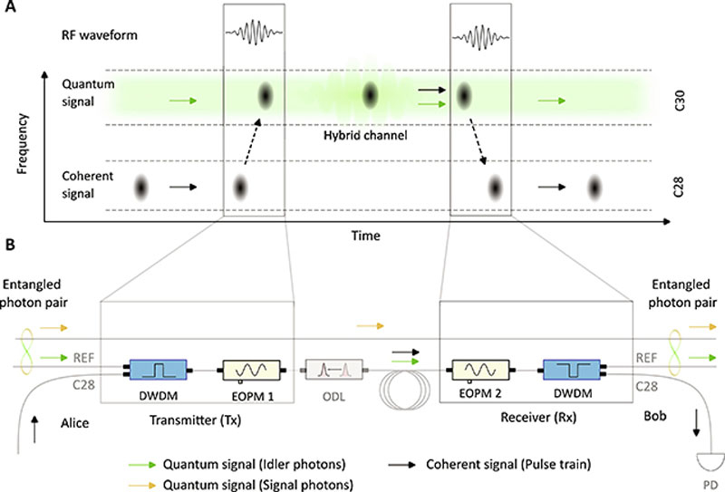 Para combinar um sinal óptico quântico e convencional em um canal, os cientistas usaram um modulador caseiro com mudança linear de fase ou atraso (o chamado serródino). A fase serrodina muda o sinal óptico na fibra óptica (em um canal de frequência) para acomodar dados quânticos e clássicos. A experiência tem mostrado que isso não destrói o emaranhado de fótons. Na saída, da mesma forma, os fluxos são divididos em quânticos e convencionais para processamento cada um em seu próprio receptor.