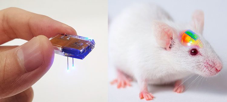 Além disso, o implante recebeu um chip Bluetooth integrado com eficiência energética e duas fontes de luz LED de mícron nas pontas de prova mais finas. Os LEDs nas sondas são inseridos em uma determinada área do cérebro, oposta aos neurônios-alvo. Os flashes de LED podem ser controlados por meio de um aplicativo simples para smartphone. A luz causa excitação nos neurônios-alvo e faz com que o cérebro do animal reaja com base nas partes do cérebro que são estimuladas.