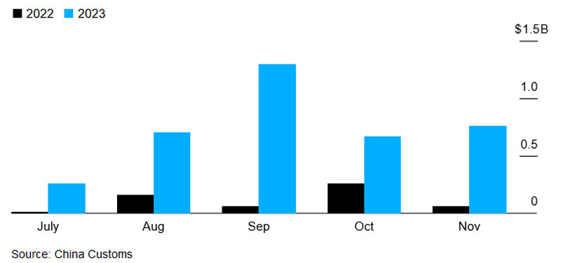 Dados alfandegários chineses sobre a taxa de importação de equipamentos ASML para a China em 2023 em comparação com 2022. Fonte da imagem: www.bloomberg.com