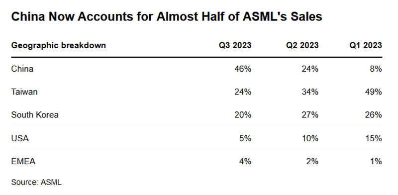 Antecipando outra proibição do novo ano de 2024, a China aumentou fortemente as suas compras de equipamentos, e a quota de vendas de produtos ASML para a China aumentou sequencialmente de 8% no primeiro trimestre para 24% no segundo e para 46% no terceiro. Só podemos imaginar o que o quarto trimestre irá mostrar, quando eles tentaram empurrar o maior número possível de sistemas litográficos e equipamentos relacionados através da porta fechada.