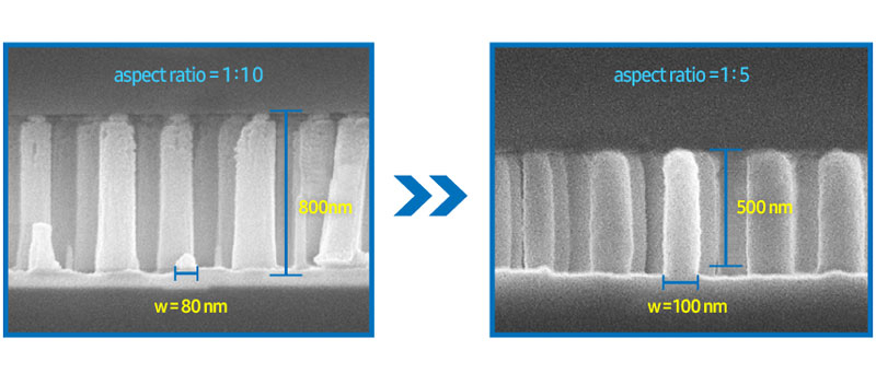 Outro aspecto do desenvolvimento também está relacionado ao nível de defeitos. Se a altura dos elementos metalenses for igual a um comprimento de onda da luz, cada nanoelemento será obtido com uma proporção de 1:10. Os fios já finos dos elementos refrativos são extremamente frágeis durante a produção. O novo desenvolvimento permite fios mais curtos, o que altera a proporção de cada um deles para 1:5. Como resultado, as nanoestruturas se tornam mais resistentes e menos suscetíveis à formação de cascas durante a produção em massa.