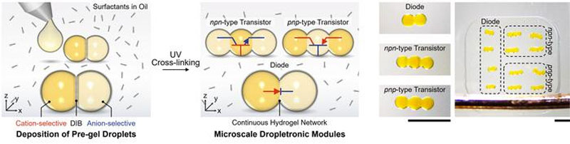 Os pesquisadores até criaram um nome para a nova eletrônica: dropletronics. Cada gota tem volume de vários nanolitros e, dependendo da composição, pode ter condutividade catiônica (p) ou aniônica (n), semelhante às transições em semicondutores. Assim, diodos, transistores e circuitos lógicos podem ser criados a partir de gotículas com diferentes condutividades. Por exemplo, os pesquisadores desenvolveram um circuito eletrônico capaz de contar os ritmos cardíacos por meio de sinais vindos diretamente do músculo cardíaco.