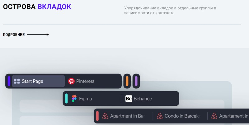 A escolha da ilha como local para viver não é acidental. Como parte de sua campanha de marketing, o Opera está promovendo uma das novas adições ao conjunto de recursos do navegador: Tab Islands. Tab Islands permite agrupar abas de forma elegante, complementando o agrupamento com codificação de cores ergonômica, o que é especialmente útil para quem gosta de manter dezenas ou centenas de abas abertas.