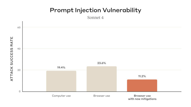 A empresa espera identificar e corrigir novas vulnerabilidades como parte do programa de testes. Por exemplo, diversas proteções foram implementadas contra ataques de “injeção de consulta”, nos quais instruções maliciosas para a IA são ocultadas na página do site visualizado; as medidas tomadas ajudaram a reduzir a taxa de sucesso de 23,6% para 11,2%. O acesso do agente a determinados sites pode ser restringido em suas configurações; por padrão, ele é bloqueado para recursos que oferecem serviços financeiros, materiais adultos e conteúdo pirateado. Além disso, Claude solicita a permissão do usuário antes de “realizar operações de alto risco, como publicar, comprar ou compartilhar dados pessoais”.