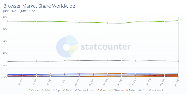 De acordo com a StatCounter, empresa de análise, o Google Chrome é usado atualmente em 65,87% dos computadores pessoais com conexão de rede global e, de acordo com esse indicador, o navegador da web ocupa uma posição de liderança no mundo. Safari (18,61%) ocupa o segundo lugar na classificação de audiência, Microsoft Edge (3,26%) está na terceira posição com uma participação de mercado de 4,13%.