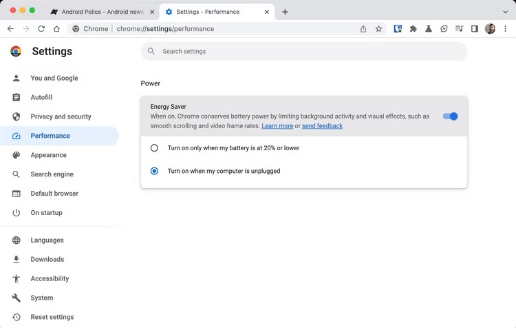 A principal inovação é a opção de economizar RAM, que é conseguida hibernando abas inativas. Essa abordagem permite reduzir o consumo de recursos necessários para exibir guias em segundo plano. Os usuários poderão personalizar ainda mais essa opção para que as guias selecionadas continuem sendo atualizadas em segundo plano. Também será possível desabilitar completamente a opção de economizar RAM. Observe que essa opção também ajudará a reduzir o consumo de energia do dispositivo, o que pode ser relevante para proprietários de laptops que usam o Chrome.