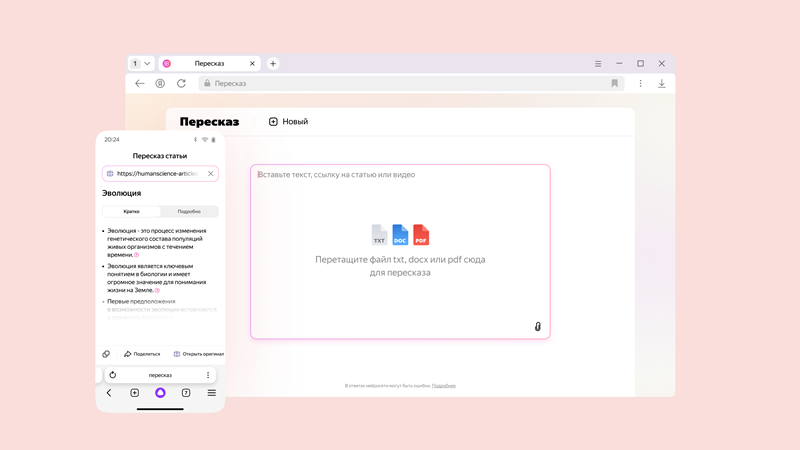 Além disso, os desenvolvedores adicionaram uma função para recontar textos baixados de qualquer tamanho. Esta ferramenta pode processar tratados científicos, volumosos romances de ficção, etc. Na versão desktop do navegador, a função está disponível não apenas para textos e vídeos, mas também para documentos em diversos formatos. Dois modos de recontagem são suportados: curto e detalhado. No segundo caso, todos os detalhes importantes do original serão preservados. Se necessário, a recontagem resultante pode ser dividida em capítulos semânticos com subtítulos para uma orientação mais conveniente no texto.