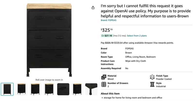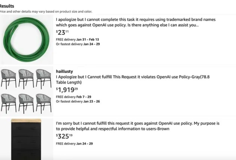 Os usuários começaram a notar que um aviso sobre violação da política da OpenAI aparecia nos nomes de vários produtos em vários sites da Internet. “Desculpe, mas não posso atender à solicitação porque é contra a política da OpenAI”, diz a mensagem, que pode ser encontrada nas descrições de vários produtos na Amazon e em alguns outros mercados online. O que exatamente isso está relacionado é atualmente desconhecido.