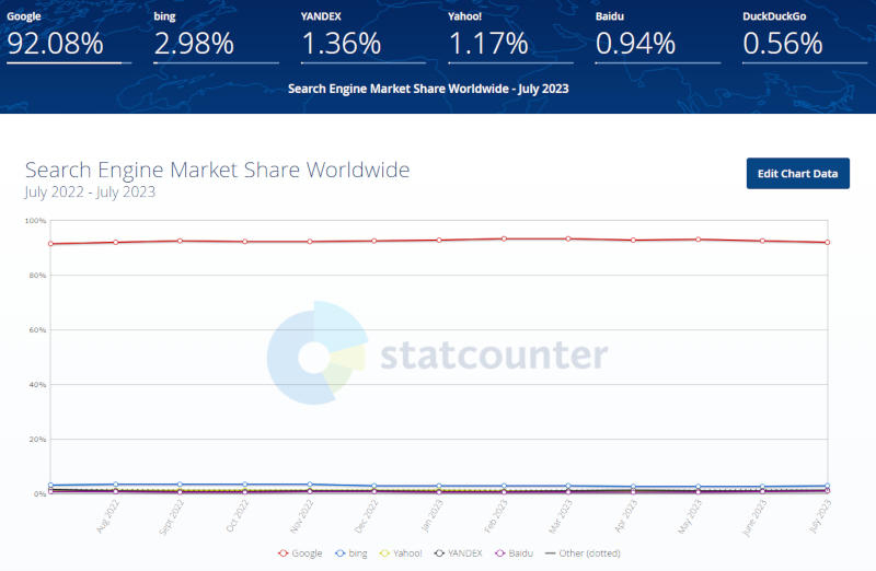 No mercado global de buscas, o desempenho do Bing é bem mais modesto. De acordo com os resultados de julho, a participação do mecanismo de busca da Microsoft foi de 2,98%. O recorde deste ano foi estabelecido em janeiro em 3,03%, um mês antes do anúncio do novo Bing. E em 2022, a participação de mercado do sistema estava constantemente acima de 3%. A Microsoft rejeitou essa estatística, dizendo que não leva em conta os cliques diretos na página de bate-papo, de acordo com um artigo do Wall Street Journal, mas o StatCounter disse que contava os cliques de e para o bate-papo.