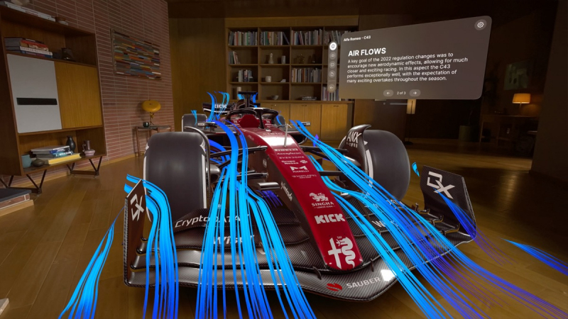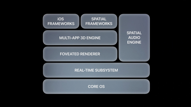 No nível da arquitetura, o visionOS compartilha blocos com MacOS e iOS, mas adiciona um novo “subsistema em tempo real” para processamento visual interativo no Apple Vision Pro. A interface visionOS 3D permite que os aplicativos sejam liberados dos limites de uma exibição tradicional para que possam ser exibidos lado a lado em diferentes escalas. A interface do usuário responde dinamicamente à luz natural lançando sombras para ajudar a transmitir escala e distância.