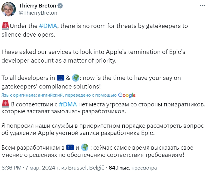 Ao mesmo tempo, a União Europeia aprovou a Lei dos Mercados Digitais (DMA), que, entre outras coisas, forçou a Apple a permitir lojas de aplicativos iOS de terceiros na União Europeia. A Epic pretendia lançar sua loja de aplicativos iOS, para a qual criou uma nova conta de desenvolvedor na App Store. E recentemente a Apple bloqueou esta conta, dizendo, nomeadamente, que não acredita que a Epic cumpra as regras desta vez. Ao mesmo tempo, o chefe da Epic Games, Tim Sweeney, garantiu à Apple que “a Epic e suas subsidiárias agem de boa fé e cumprirão todos os acordos atuais e futuros com a Apple, e também estão prontas para fornecer todas as garantias necessárias sobre quaisquer questões .”