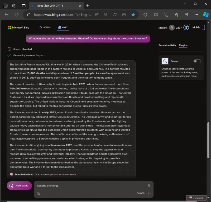 A capacidade do Bing Chat de responder a consultas relacionadas a eventos entre janeiro e abril de 2023 também confirma que o modelo GPT-4 Turbo é usado para responder a consultas.