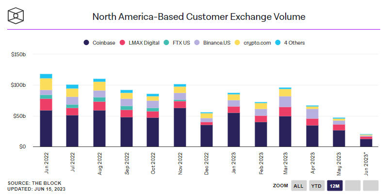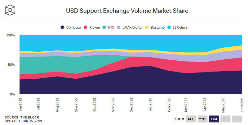 Distribuição de quotas de mercado das bolsas de criptomoedas americanas. Fonte da imagem: theblock.co