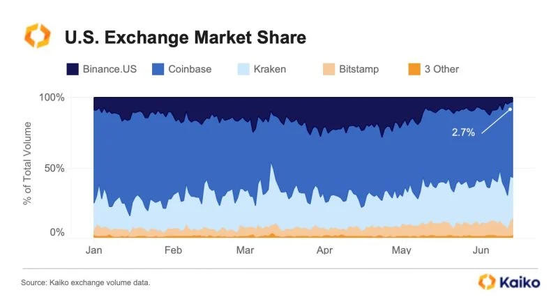 A participação de mercado da exchange cripto Binance.US nos Estados Unidos caiu para seu nível mais baixo nos últimos dois anos – totalizou apenas 2,7%, de acordo com especialistas da Kaiko, especializada em análises do setor de criptomoedas.