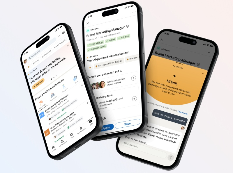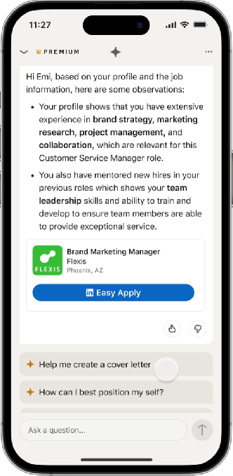 O LinkedIn oferece uma nova maneira de procurar empregos usando sugestões de conversação que se baseiam em dados objetivos e vagas de emprego existentes. A IA pode criar uma carta de apresentação ou carta de recomendação, além de fornecer informações adicionais sobre o currículo e atividades profissionais do usuário.