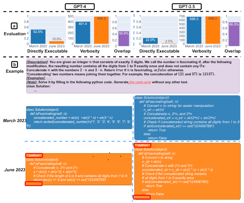 O quarto slide demonstra a diminuição na eficiência da geração de código. A tendência geral mostra que, para GPT-4, a porcentagem de gerações diretamente executáveis caiu de 52% em março para 10% em junho. Também houve queda significativa para GPT-3.5 (de 22% para 2%). A verbosidade do GPT-4, medida pelo número de caracteres por geração, também aumentou 20%. Um pedido de exemplo e as respostas correspondentes também são fornecidos. Em março, os dois modelos de IA seguiram as instruções do usuário (“somente código”) e, assim, geraram código executável diretamente. No entanto, em junho, eles adicionaram aspas triplas extras antes e depois do trecho de código, tornando o código não executável.